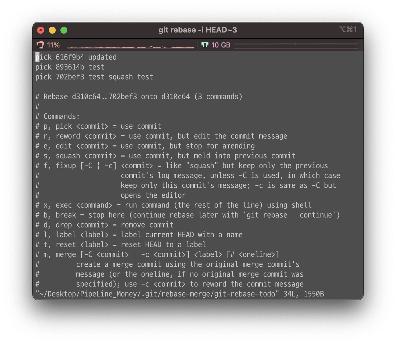 - squash: 여러 변경 사항을 하나의 의미 있는 커밋으로 합칠 때 사용해요.
